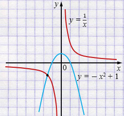 в) Рассматриваем гиперболу \(y=\frac{1}{x}\) и параболу \(y=-x^2+1\). При положительных \(x\) обе функции могут быть положительными, поэтому существует точка пересечения. При отрицательных \(x\) знаки различны, пересечения нет.