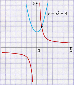 г) Левая часть \(y=3+x^2\) — парабола, всегда положительная. Правая часть \(y=\frac{12}{x}\) положительна при \(x>0\) и отрицательна при \(x<0\). Поэтому возможна точка пересечения только при \(x>0\), и она одна.