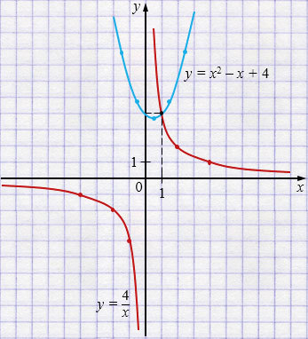 Гипербола \(y=\dfrac{4}{x}\) имеет две ветви и не определена при \(x=0\). Парабола \(y=x^2-x+4\) направлена вверх. Полученное уравнение показало, что в действительной плоскости они имеют ровно одну общую точку \((1;4)\), то есть графики пересекаются только в этой точке.