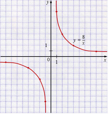 Для \(y=\dfrac{8}{x}\) ветви расположены в I и III четвертях (при \(x>0\) — \(y>0\), при \(x<0\) — \(y<0\)).