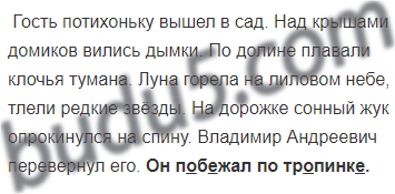 Гость потихоньку вышел в сад. Над крышами домиков вились дымки. По долине плавали клочья тумана. Луна горела на лиловом небе, | тлели редкие звёзды. На дорожке сонный жук | опрокинулся на спину. Владимир Андреевич перевернул его. Он побежал по тропинке.