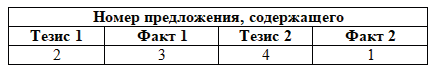 8. Прочитайте четыре предложения. Два из них являются тезисами (положениями, которые требуется аргументировать). Два других содержат факты, которые могут помочь при аргументации этих тезисов. Подберите для каждого из тезисов соответствующий ему факт. Номера выбранных предложений запишите в таблицу.