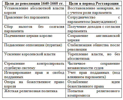 2. Привлекая при необходимости дополнительные источники, сравните цели, которые стояли перед английскими монархами до революции 1640-1660 гг., и их цели в период Реставрации. Запишите в таблицу.