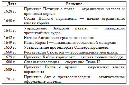 Используя текст учебника и при необходимости дополнительные источники информации, составьте таблицу, в которой будут отражены этапы становления в Англии конституционной монархии.