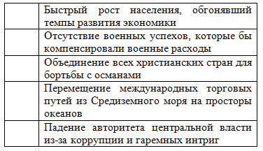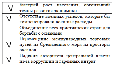 3. Отметьте в левой колонке те причины, которые в конце XVI в. способствовали застою в развитии Османской империи и в дальнейшем привели к её упадку (всего четыре).