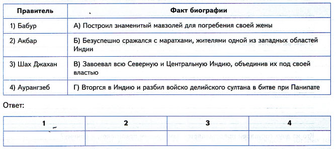 1. Установите соответствие между именами правителей империи Великих моголов и фактами их биографий, проставив нужные буквы в таблицу.