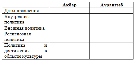 2. Сравните правления Акбара и Аурангзеба, заполните таблицу и ответьте на вопросы.