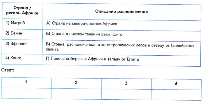 1. Установите соответствие между названием страны (или региона) Африки и описанием его расположения, проставив нужные буквы в таблицу.