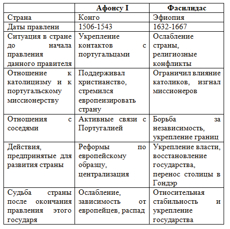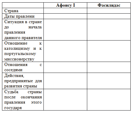 7. Сравните правление Афонсу I и Фасилидаса, заполните таблицу и ответьте на вопросы.