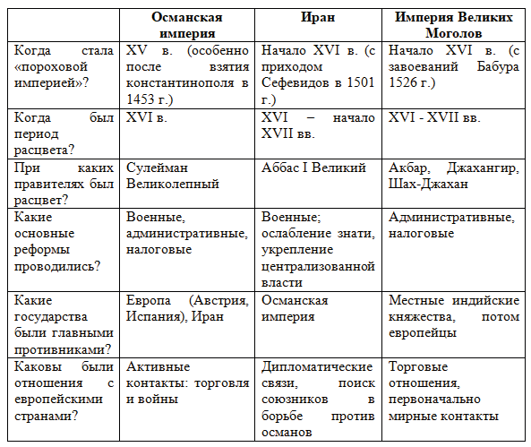 7. Сравните исламские "пороховые империи", заполните таблицу и выполните задание.