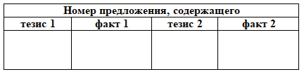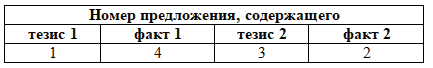 6. Прочитайте четыре предложения. Два из них являются тезисами (положениями, которые требуется аргументировать). Другие два содержат факты, которые могут послужить для аргументации этих тезисов. Подберите для каждого из тезисов соответствующий ему факт. Номера соответствующих предложений запишите в таблицу.