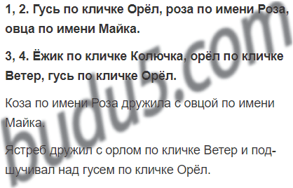 1. Гусь по кличке (орёл) щипал куст (розы). 2. Коза по имени (роза) дружила с овцой по имени (майка). Обе они не любили есть (колючки). 3. Ёжик по кличке (колючка) носил голубую (майку). 4. Ястреб дружил с (орлом) по кличке (ветер) и подшучивал над гусем по кличке (орёл).