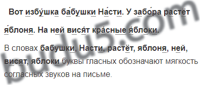 Спиши предложения, заменяя рисунки словами. В этих словах подчеркни буквы гласных, поставь ударение. Проверь написанное. В каких словах буквы гласных обозначают мягкость согласных звуков на письме?