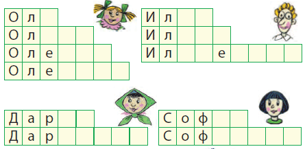 Как зовут этих ребят? Впиши в клетки недостающие буквы. Запиши эти слова. Подчеркни буквы, которые обозначают мягкость согласных звуков на письме. В каких словах ь разделительный? Какие звуки он разделяет?