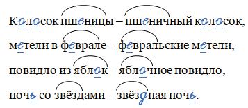К_л_сок пш_ницы – пш_ничный к_л_сок, м_тели в ф_врале – ф_вральские м_тели, повидло из ябл_к – ябл_чное повидло, ноч_ со звёздами – звёз_ная ноч_.