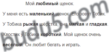 У меня есть ... щенок. Его зовут Тобик. У Тобика ... шёрстка, она ... и ... . Хвостик у Тобика ... . Мой щенок очень ... . Он любит бегать и играть.