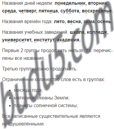 Сколько слов ты записал в каждую группу? Можно ли продолжить этот список? Почему? В каких ещё тематических группах имён существительных количество слов ограничено? Одушевлённые или неодушевлённые имена существительные ты записал?