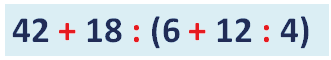 42 + 18 : (6 + 12 : 4) = 42 + 18 : (6 + 3) = 42 + 18 : 9 = 42 + 2 = 44