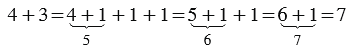 Мы видим, что когда мы прибавляем к натуральному числу 1, получаем следующее за ним натуральное число, т.е. следующее число больше предыдущего на единицу. Теперь к 4 прибавим 3: 4+3: для этого к 4 прибавим 3 раза единицу. Учитывая, что при прибавлении к числу единицы получаем следующее число, получим: