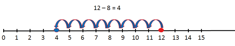 Для вычитания с помощью координатного луча, отметим точку соответствующую уменьшаемому, в нашем примере, это число 12. Для вычитания отсчитываем влево количество единичных отрезков равных вычитаемому (8). Получившаяся точка будет являться разницей (4).