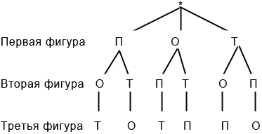 Данный метод заключается в построении схемы, которая и называется деревом возможных вариантов. Данная схема действительно похожа на перевернутое дерево, "корень" которого обозначается "*". Построим данную схему для нашей задачи: Для этого от "корня" проведем три "ветки" - отрезки, на концах которых подпишем варианты фигур, которые мы можем взять за основание. Далее от каждой фигуры проводим такое количество "веток", которое будет соответствовать числу вариантов фигур на втором месте, в нашем случае по две "ветки" от каждой фигуры. Затем от каждой фигуры, стоящей на втором месте, проводим такое число "веток", которое будет соответствовать числу вариантов фигур на третьем месте, в нашем случае по одной "ветке" от каждой фигуры. Тогда имеем следующее дерево возможных вариантов: