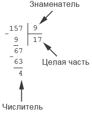 | Чтобы неправильную дробь, числитель которой нацело не делится на знаменатель, преобразовать в смешанное число, надо числитель разделить на знаменатель; полученное неполное частное записать как целую часть смешанного числа, а остаток - как числитель его дробной части. |
