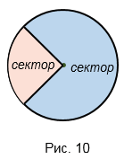 Часть круга, ограниченную двумя радиусами называют сектором, на рисунке 10 два сектора.
