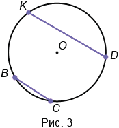 2. Хорда - это отрезок, соединяющий две точки окружности. У любой окружности можно провести бесконечно много хорд. На Рис.3 ВС и KD - хорды окружности с центром в точке О.