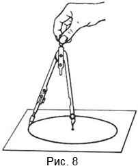 Для того, чтобы построить окружность используют специальный прибор, который называется циркулем (Рис.6). Циркуль состоит из двух частей, соединённых шарниром. Обычно на конце одной из них располагается игла, на конце другой — пишущий предмет, например грифель карандаша.