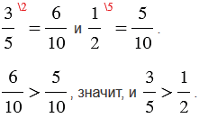 Чтобы сравнить две дроби с разными знаменателями, надо: 1) привести данные дроби к общему знаменателю; 2) применить правило сравнения дробей с одинаковыми знаменателями. |
