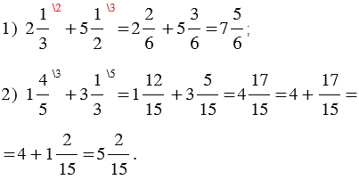 Чтобы выполнить сложение смешанных чисел, нужно: 1) привести дробные части этих чисел к наименьшему общему знаменателю; 2) отдельно выполнить сложение целых частей и отдельно дробных частей. Если при сложении дробных частей получилась неправильная дробь, выделить целую часть из этой дроби и прибавить ее к полученной целой части. |