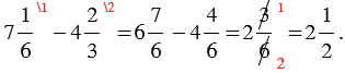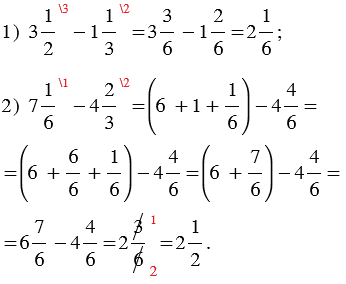 Чтобы выполнить вычитание смешанных чисел, нужно: 1) привести дробные части этих чисел к наименьшему общему знаменателю; если дробная часть уменьшаемого меньше дробной части вычитаемого, превратить ее в неправильную дробь, уменьшив на единицу целую часть; 2) отдельно выполнить вычитание целых частей и отдельно дробных частей. |
