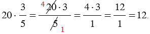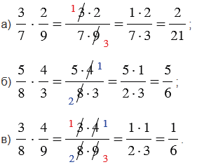 Если мы перемножаем дроби, у которых можно сократить числитель первой и знаменатель второй дроби и (или) знаменатель первой и числитель второй дроби, то сначала выполняют сокращение, а затем умножение (такой ход действий облегчает вычисления).