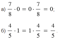 Для обыкновенных дробей, как и для натуральных чисел, выполняются свойства умножения (переместительное свойство умножения, сочетательное свойство умножения, распределительные свойства умножения относительно сложения и относительно вычитания). Также при умножении дроби на ноль (или нуля на дробь) получаем ноль, и при умножении дроби на единицу (или единицы на дробь) получим равную ей дробь.