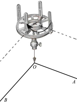 Пример: Чтобы измерить угол, астролябию устанавливают в его вершине (в нашем случае точка O), при этом лимб её должен быть в горизонтальной плоскости, а отвес,повешенный в центе диска, должен находиться точно над вершиной угла. Затем необходимо установить алидаду вдоль одной из сторон угла (в нашем случае OA), заметить деление, напротив которого находится указатель алидады. Далее необходимо повернуть алидаду по ходу часовой стрелки, так чтобы она совпала со второй стороной угла (в нашем случае OB), отметить деление, напротив которого оказался указатель алидады. Тогда, если мы найдем разность второго и первого измерения, мы найдем градусную меру измеряемого угла (в нашем случае угла AOB).