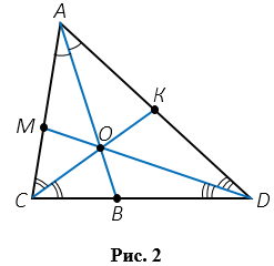 Любой треугольник имеет три биссектрисы. На Рис.2, АВ, СК, DМ - биссектрисы треугольника АСD. Биссектриса АВ соединяет вершину А с точкой В, лежащей на стороне СD (