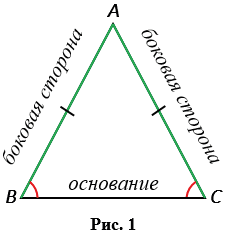 Ни Рис.1 треугольник АВС - равнобедренный, АВ = АС - боковые стороны, ВС - основание,