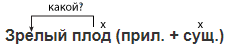 В словосочетании зрелый плод главное слово — плод, так как от него задаётся вопрос: плод (какой?) зрелый. Весёлый — зависимое слово. Главное слово выражено именем существительным, зависимое — прилагательным. Зависимое слово связано с главным по смыслу и с помощью окончания.