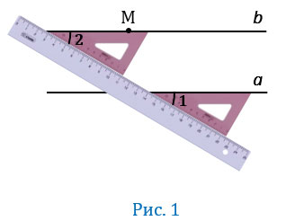 , а к нему прикладываем линейку так, как показано на рисунке 1. Далее передвигаем угольник вдоль линейки до тех пор, пока точка М не окажется на стороне угольника, и проведем прямую