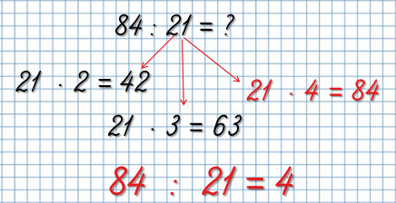 В числе 84 – 8 десятков и 4 единицы; делю 8 десятков на 4, получаю 2 десятка, или это число 20; далее делю 4 единицы на 4 и получаю число 1. Теперь к 20 прибавляю 1 и получаю 21. Тогда,