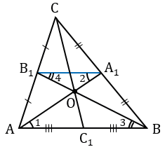 Следовательно, точка О, в которой пересекаются медианы АА1 и ВВ1 делит каждую из них в отношении 2 : 1, считая от вершины.