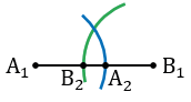 Теперь строим окружности с центрами в точках А1 и В1 таких же радиусов как и окружности с центрами в вершинах углов 1 и 2 (полностью окружности строить необязательно, смотри выделенное синим и зеленым цветом). Точки пересечения данных окружностей с отрезком А1В1 обозначаем А2 и В2 соответственно.