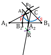 С (всю окружность строить необязательно, смотри выделенное синим). Точки пересечения данной окружности со сторонами угла С обозначаем буквами F и S. Затем строим две окружности одинакового радиуса FS с центрами в точках F и S (полностью окружности строить необязательно, смотри выделенное фиолетовым и зеленым цветом). Точку пересечения данных окружностей внутри угла С обозначаем буквой R, проводим прямую СR, которая и является биссектрисой угла С.