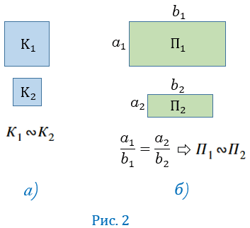 ), а также два прямоугольника, у которых две смежные стороны одного прямоугольника пропорциональны двум смежным сторонам другого (рис.2, б). Примерами подобных фигур произвольной формы являются две географические карты одного и того же района, но имеющие разный масштаб, а также фотографии одного и того же предмета, сделанные в разных увеличениях.