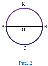 Если отрезок, соединяющий концы дуги является диаметром то, такая дуга называется полуокружностью. На рисунке 2 изображена окружность с центром О, концы диаметра АВ разделяют данную окружность на две полуокружности: