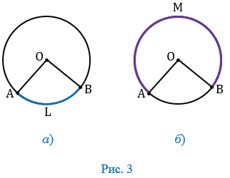 На рисунке 1 две точки А и В разделяют окружность на две дуги. На каждой дуге отмечают промежуточную точку, например L и М, для того, чтобы различать эти дуги. Обозначают дуги так: