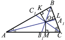В самом деле, обозначим буквой О точку пересечения биссектрис АА1 и ВВ1 треугольника АВС и проведем перпендикуляры ОК, OL и ОМ соответственно к прямым АВ, ВС и СА.