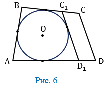 Предположим, что это не так. Тогда прямая СD либо не имеет общих точек с окружностью, либо является секущей. Рассмотрим первый случай (Рис. 6). Проведем касательную С1D1, параллельную стороне СD (С1 и D1 - точки пересечения касательной со сторонами ВС и АD).