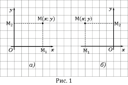 ) точки М в прямоугольной системе координат через точку М проводим прямые перпендикулярные к осям координат и обозначаем через М1 и М2 точки пересечения этих прямых с осями