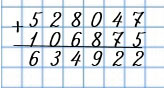 Пишу (единицы под единицами, десятки под десятками, сотни под сотнями, единицы тысяч под единицами тысяч, десятки тысяч под десятками тысяч, сотни тысяч под сотнями тысяч): 528047 + 106875.